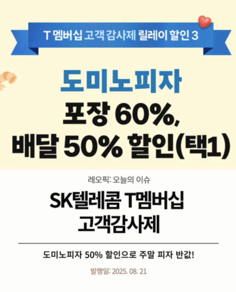 📢 SK텔레콤 고객 감사제 – 도미노피자 50% 할인 쿠폰 정리