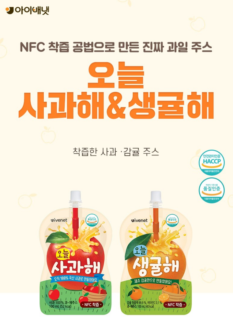 아이를 위한 이유식 브랜드로 잘 알려진 아이배냇은 까다로운 원료 선택과 철저한 품질 관리를 원칙으로 합니다. 이번 ‘오늘 사과해 & 생귤해’ 주스 역시 HACCP 인증을 받은 안전한 시설에서 만들어졌으며, 무색소, 무향료, 무설탕 원칙을 지켜 누구나 안심하고 즐길 수 있어요.